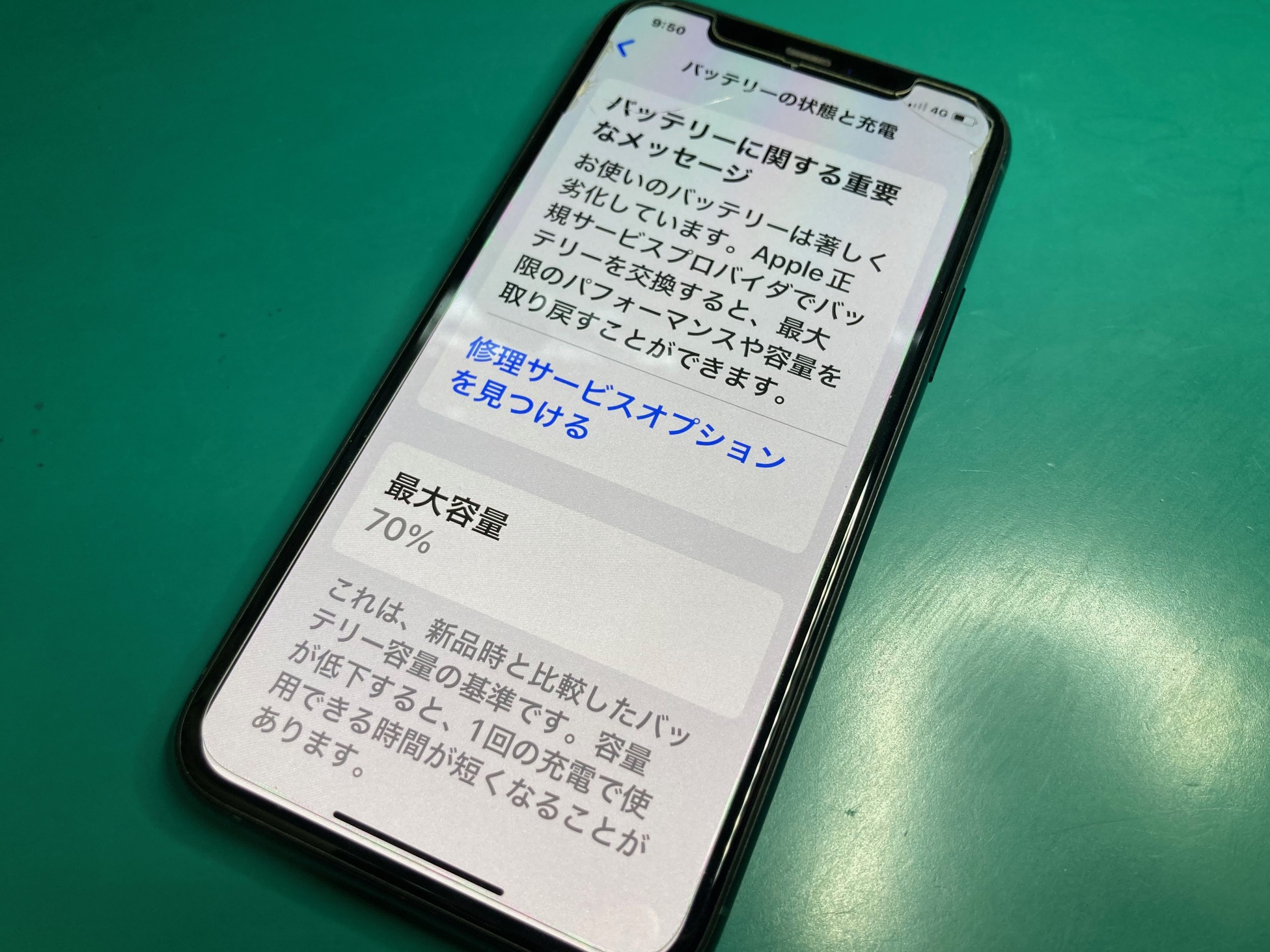 ご依頼いただいたiPhone 11Proは、最大容量が70%まで低下し、充電してもすぐに残量が減ってしまう状態でした。