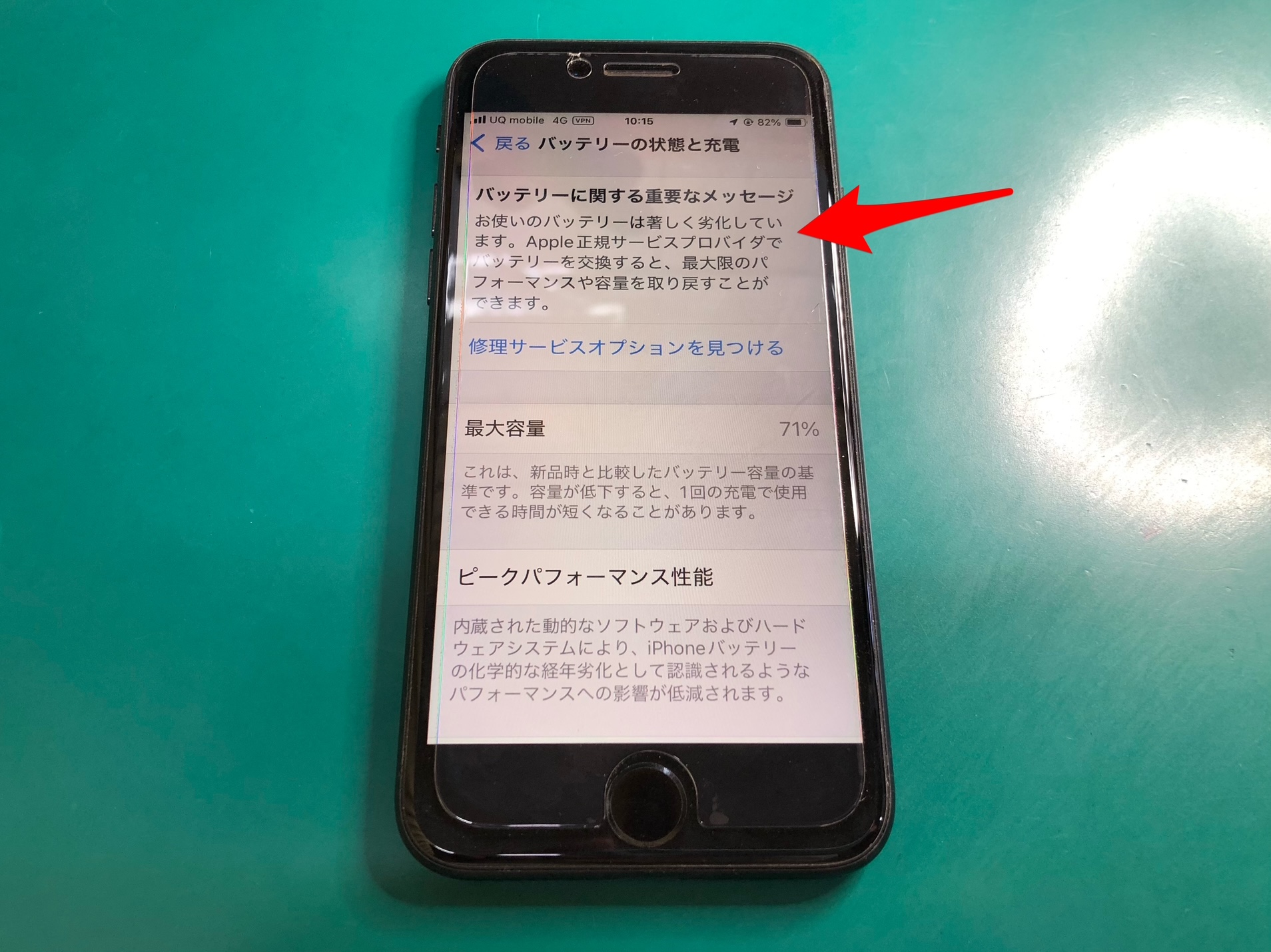 設定画面には「バッテリーが著しく劣化している」と表示されており、充電の減りが早くなっている状態でした。