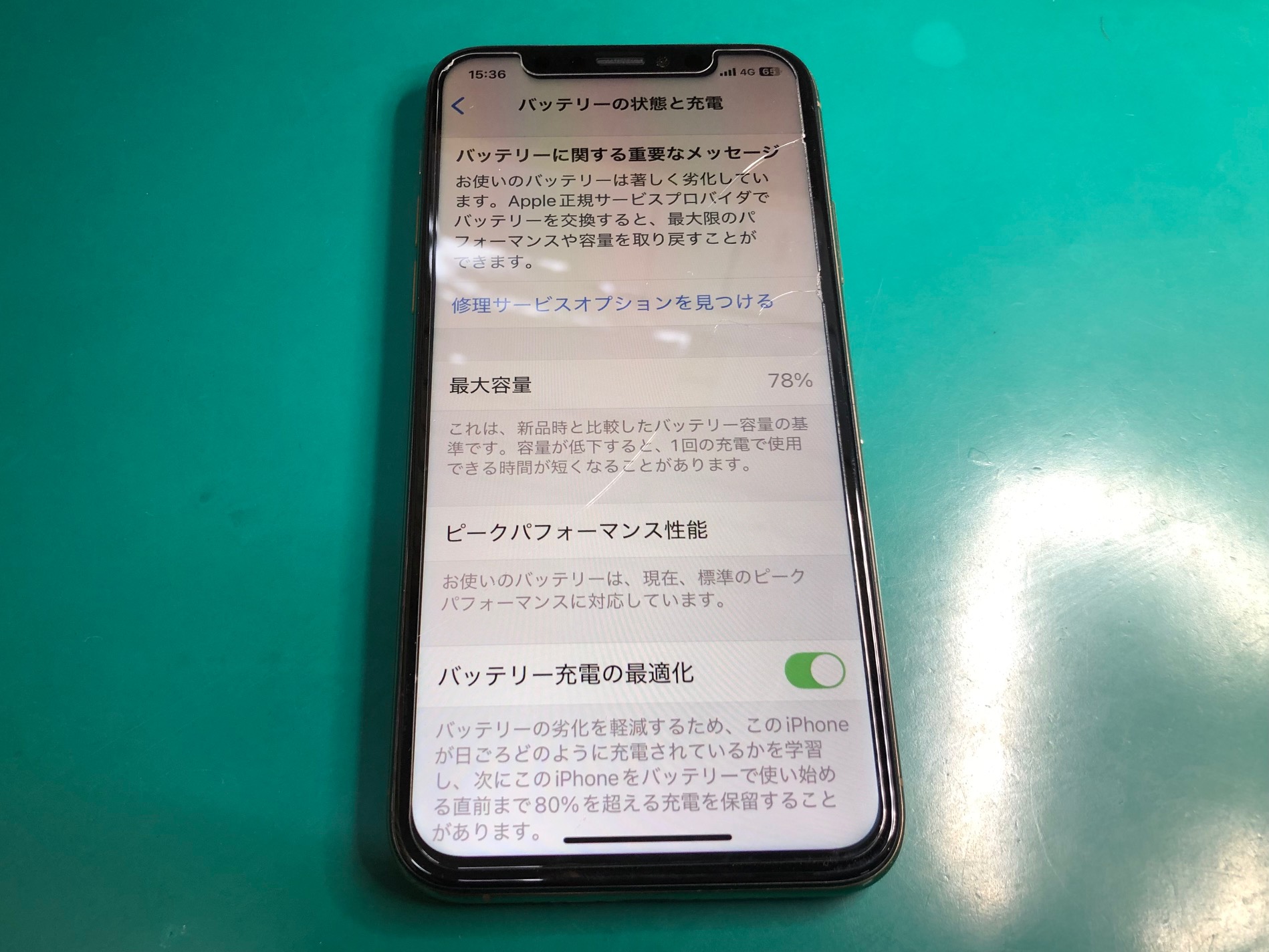 「設定」→「バッテリー」→「バッテリーの状態と充電」から確認すると、最大容量は78%。