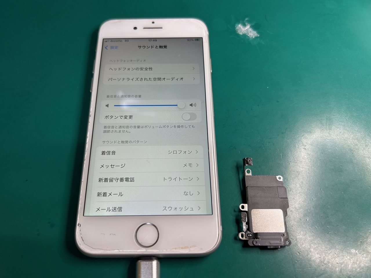 詳しく点検したところ、本体下部のラウドスピーカーが機能しておらず、上部のイヤースピーカーのみで音が出ている状態でした。