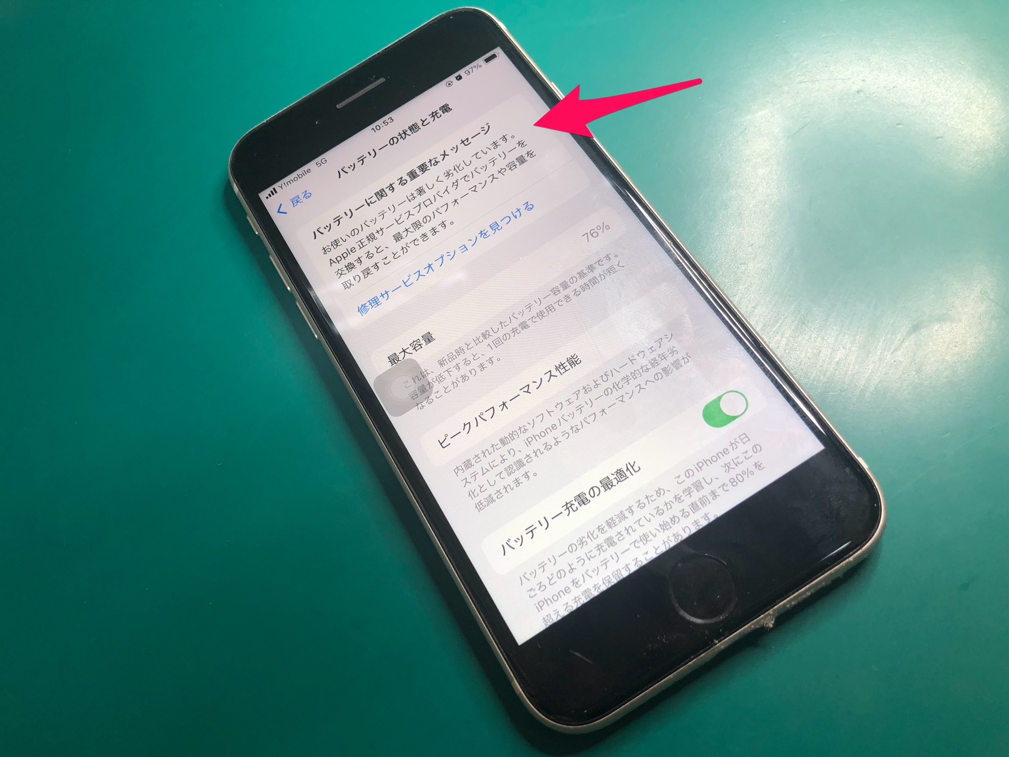 あわせて点検したところ、バッテリー最大容量が「76%」と劣化が進んでいたため、お客様とご相談のうえバッテリー交換も実施しました。