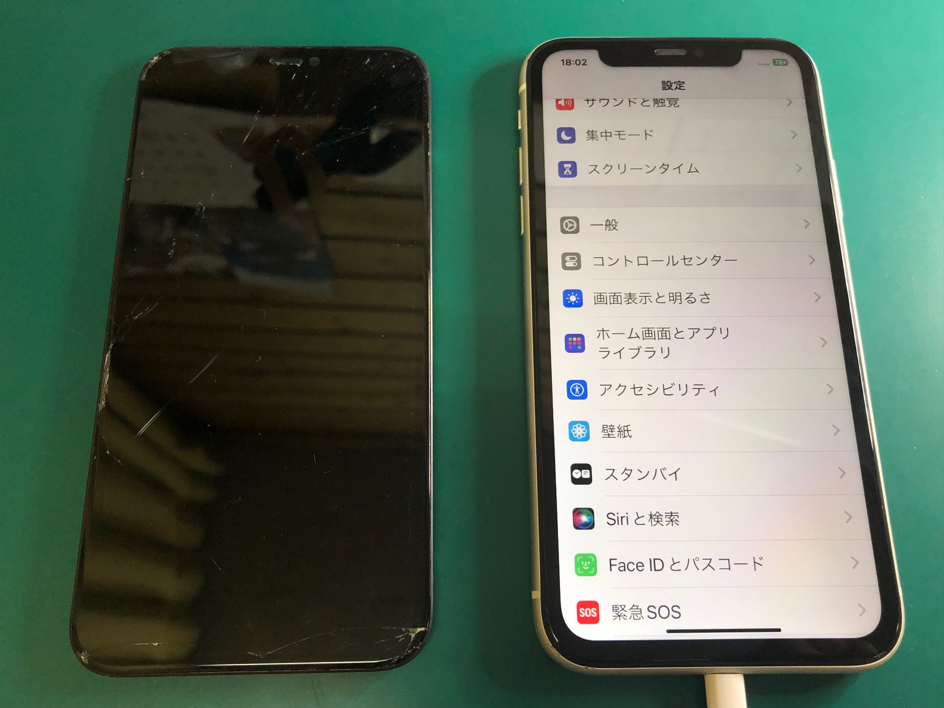 こちらは修理のご依頼をいただいたiPhone11ですが、ガラスが割れ、液晶の一部が真っ黒で表示されないなど、表示異常が見受けられました。