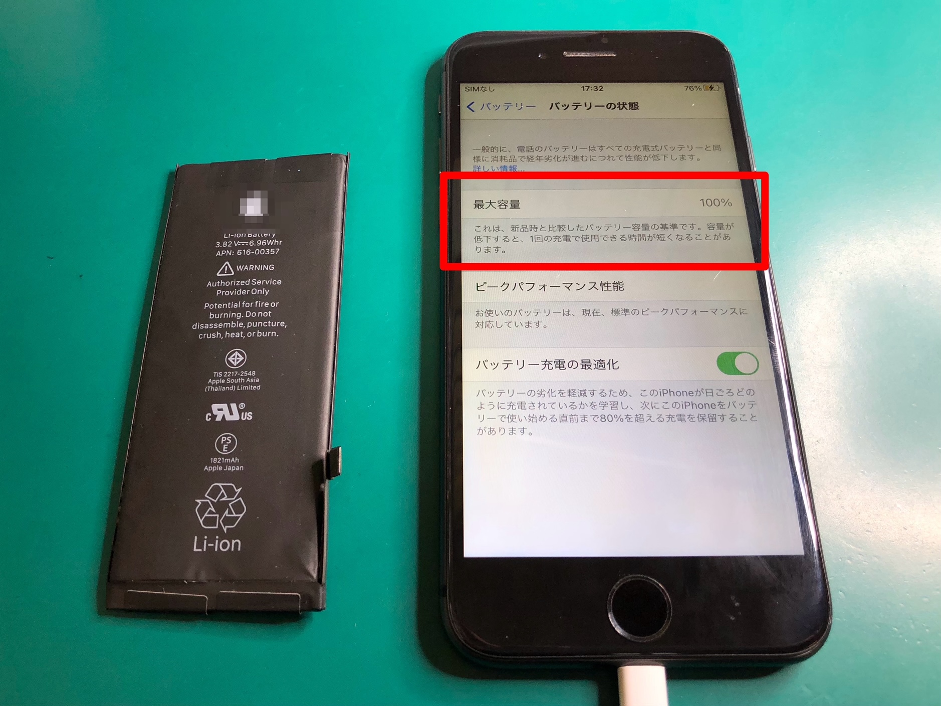 動作チェックを行い、「最大容量100%」に回復したことを確認し、作業時間40分程度でデータそのまま修理を完了しました。