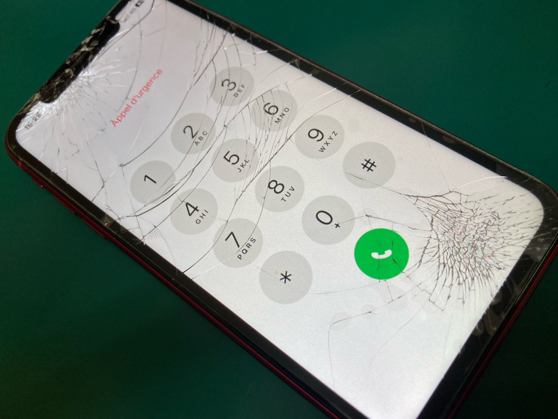 強い衝撃が加わったようで亀裂が四方八方に広がっていましたが、保護フィルムのおかげで割れたガラスが飛び散らず操作も出来る状態でした。