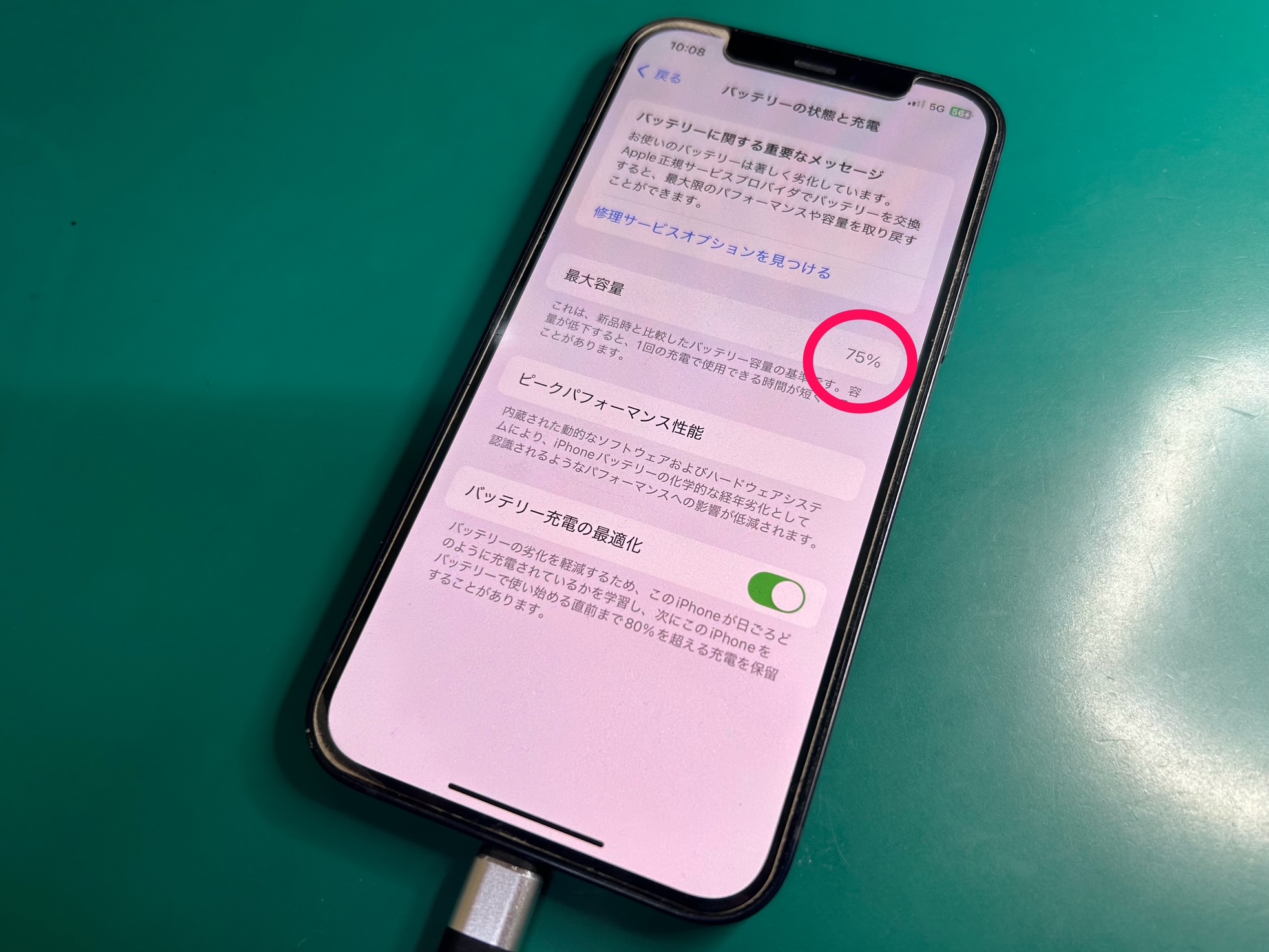 設定からバッテリーの状態を確認したところ、最大容量は75%まで低下していました。
