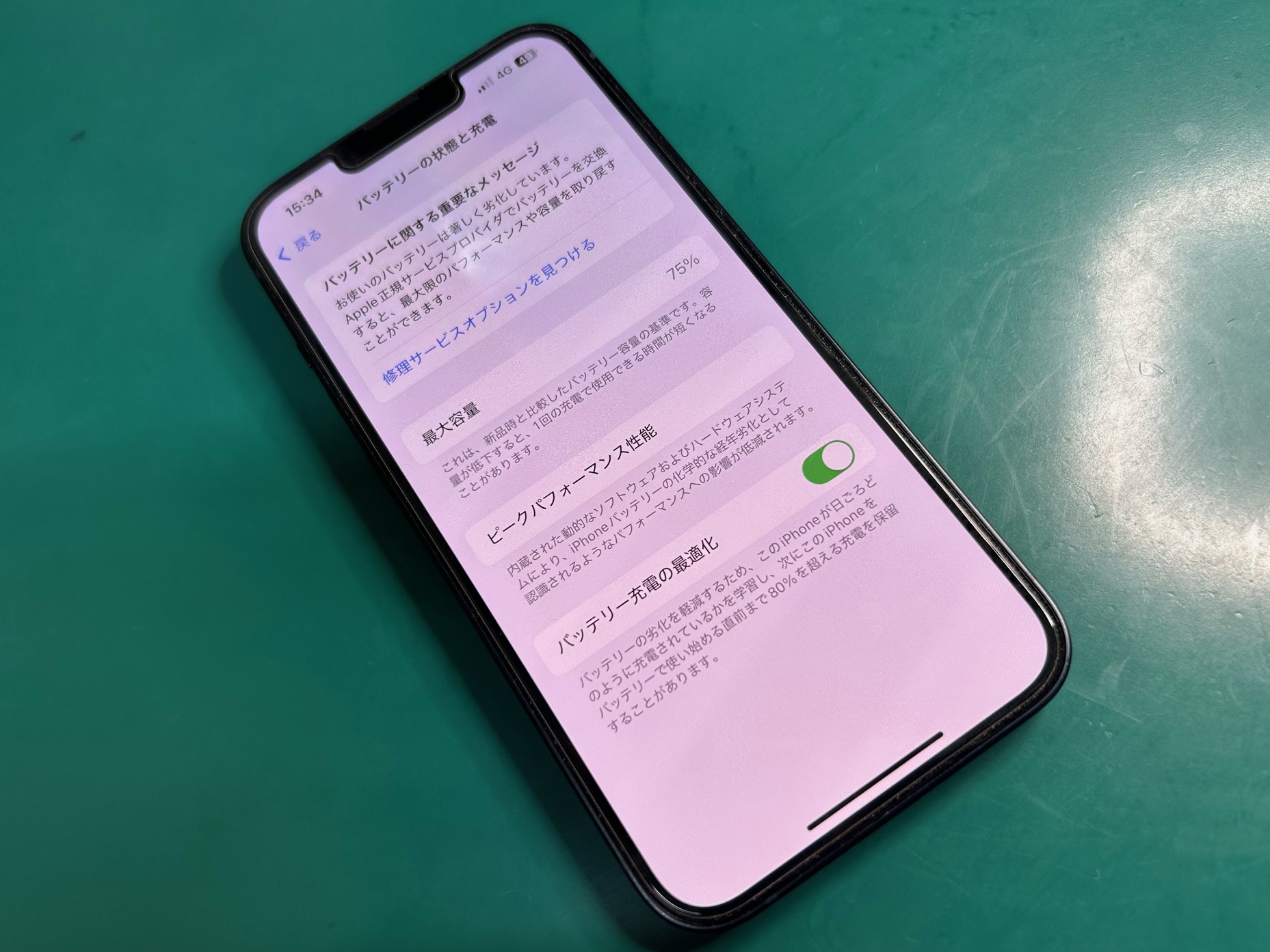 先日お預かりしたiPhone 13は、バッテリー最大容量が75%まで低下していました。