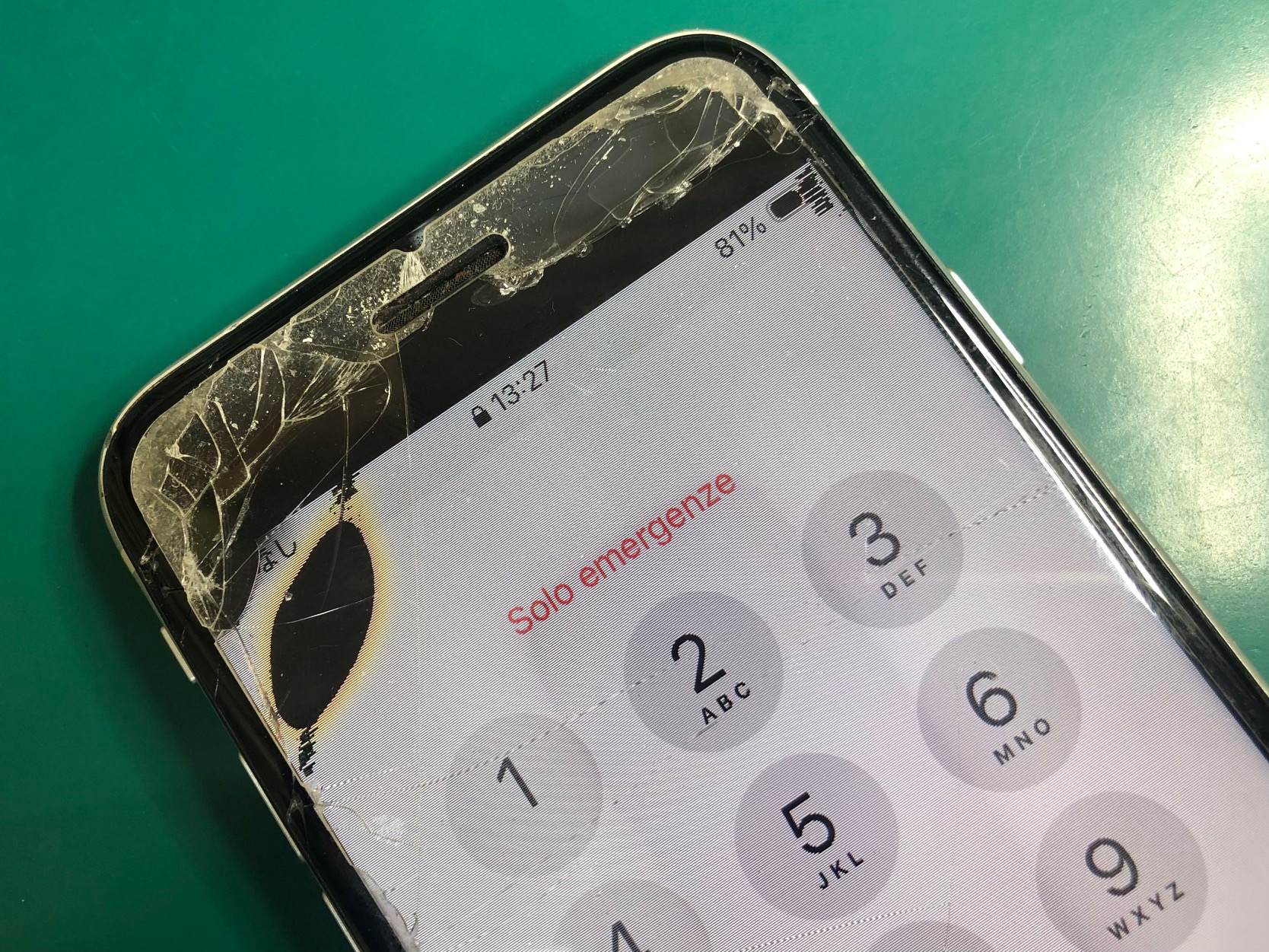 お持ち込みいただいたのは、落として画面が割れ、液晶に黒いシミが出てしまったiPhone SE(第2世代)です。