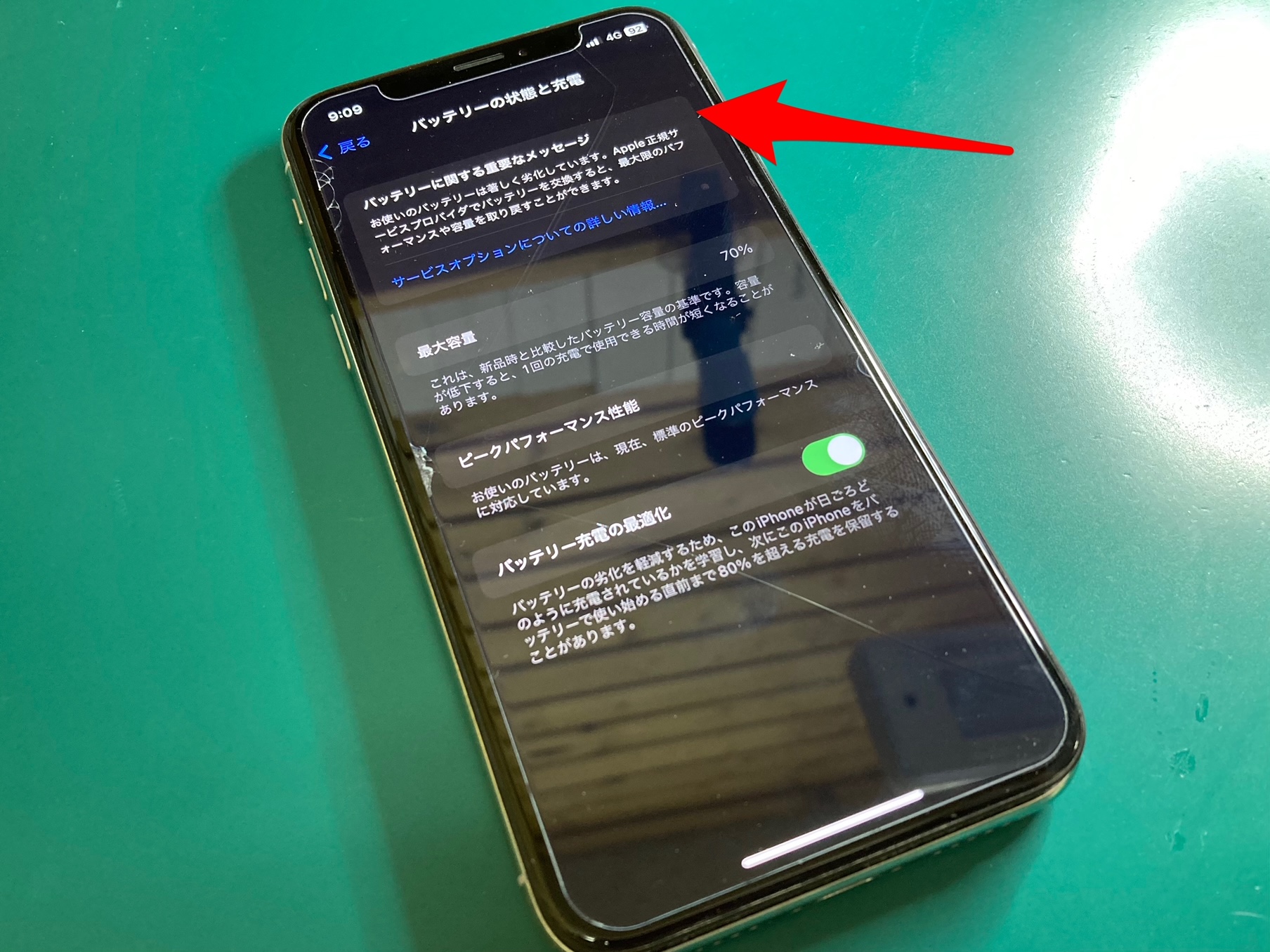 新品同様のバッテリーは「最大容量100%」と表示されますが、バッテリーの劣化に伴いこの数値は減少していきます。