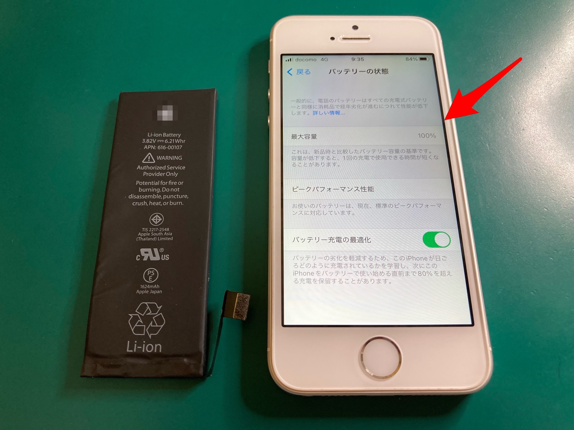 こちらは修理のご依頼をいただいたiPhoneSE(第1世代)ですが、バッテリー残量が10%単位でガクッと減ってしまうとご相談をいただきました。