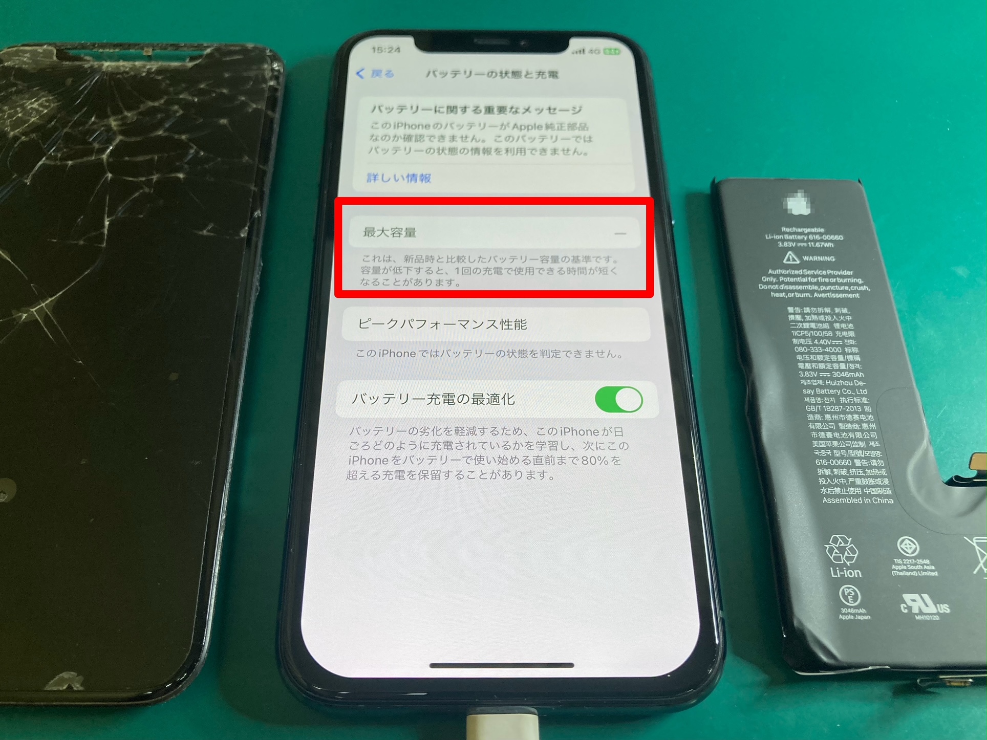 ただし、2018年製以降(iPhoneXS〜)は互換性バッテリーに交換すると、「最大容量が表示されない」「設定アプリ内に"不明な部品"と表示される」「設定アプリに赤丸①のバッジが出現する」といった仕様になっています。