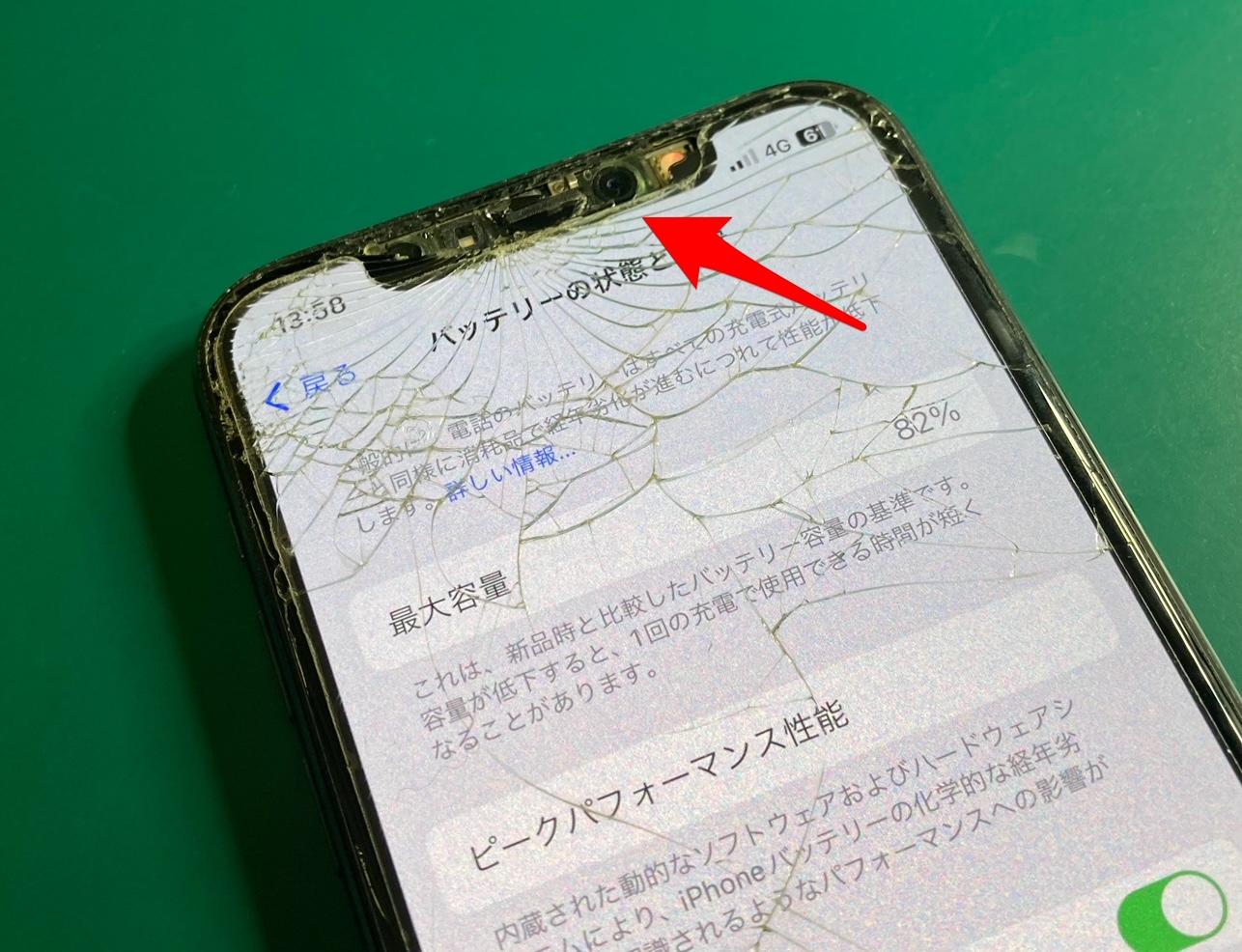 こちらは修理のご依頼をいただいたiPhoneXSですが、フロントパネルの損傷が激しく、上部内側に搭載されているインカメラやFace ID(顔認証機能)が剥き出しになっていました。