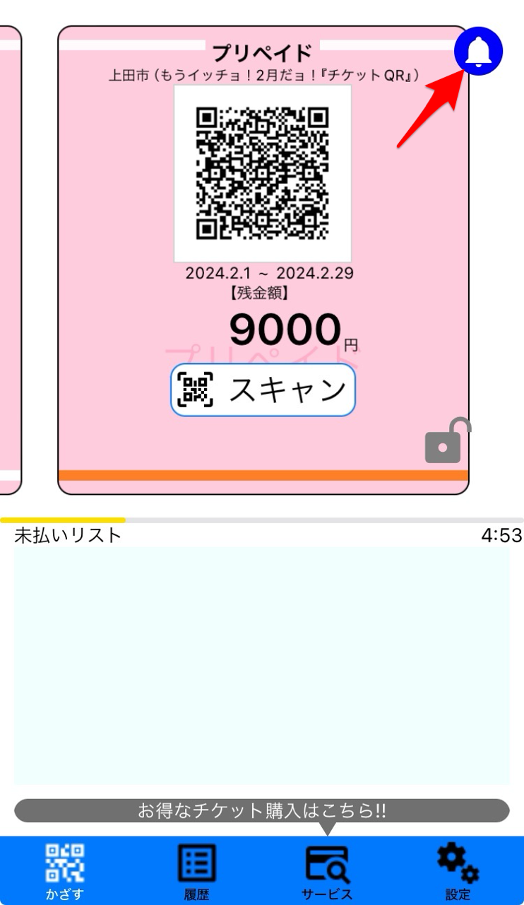 キャンペーン終了の際には、終了と同時に『チケットQR』アプリ右上のベルボタンが赤色になり、ボタンを押すと「キャンペーン終了」のお知らせが表示されます。